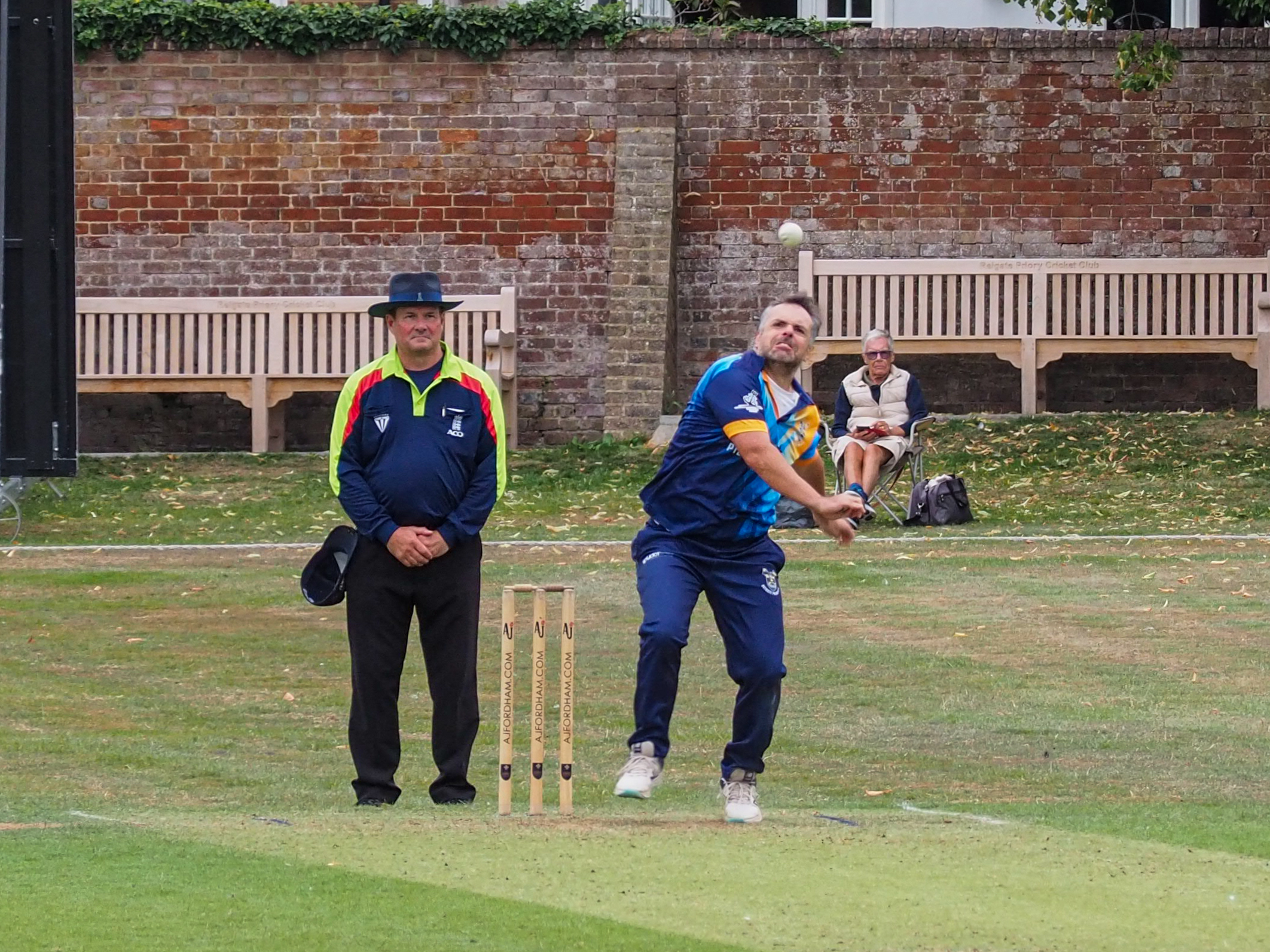 The current and ex Captains then combined as Richie took a sharp slip catch from George Ealham’s bowling (5-0-23-1) to dismiss opener Adam Helwick (22) and Esher were 55-2 in the 15th over. The Llamas were keeping a lid on the run rate with some tight bowling, particularly from Tom Massey who then got his 2nd wicket (7-2-10-2) having Alex Chambers (15) caught behind by Rory Haughton for Esher to be 76-3 in the 22nd over.